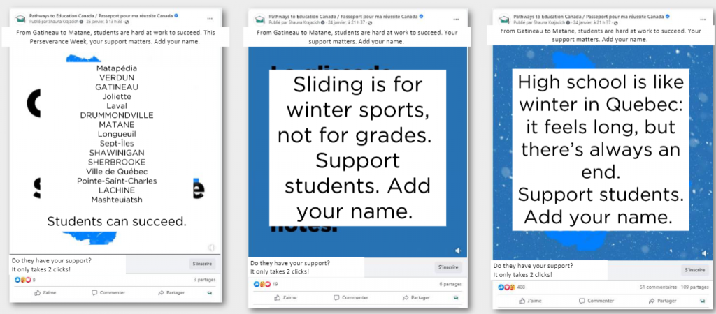 This year, Journées de la persévérance scolaire was celebrated from February 13 to 17th, and Pathways Canada’s Marketing team launched a new social media campaign to increase awareness in the province. Through Instagram and Facebook ads in French, viewers were invited to add their names to our board of support.