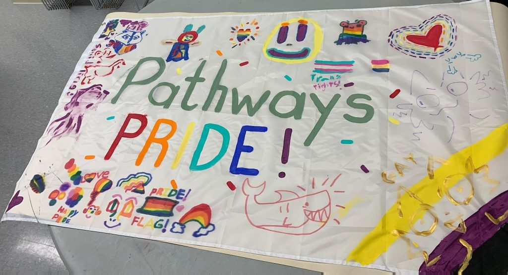 To cap off the party, students collaborated on one big Pathways Pride Flag, inspired to make it their own and represent all of their unique identities. This flag now decorates the program space as a reminder for youth struggling to authentically express themselves that they have a community that accepts and cares about them. “Not every student feels ready to engage in this way yet, but just knowing of the existence of these events can mean something even if they don’t attend. They are still hearing us talk about it and seeing that welcoming spaces are available for them. Knowing that we support them hopefully creates a safer space where, one day, they do feel comfortable sharing that part of their identity.”