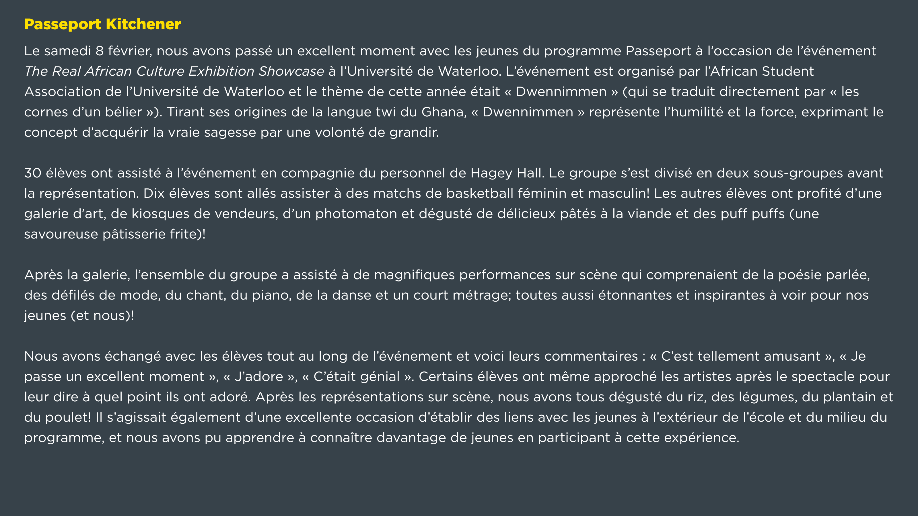 Pathways Kitchener had a wonderful time on Saturday February 8th with youth at The Real African Culture Exhibition Showcase at University of Waterloo. The event is hosted by University of Waterloo’s African Student Association, and this year’s theme was “Dwennimmen” (directly translating to “the horns of a ram”). Originating from the Twi language of Ghana,Lire la suite “Celebrating African heritage through dance, music, fashion, poetry, and film “