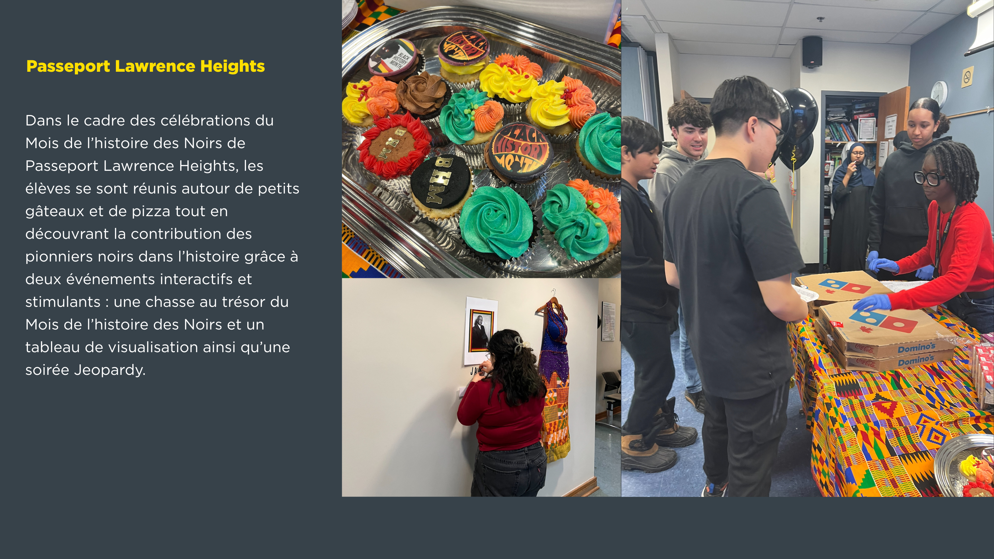 Dans le cadre des célébrations du Mois de l’histoire des Noirs de Passeport Lawrence Heights, les élèves se sont réunis autour de petits gâteaux et de pizza tout en découvrant la contribution des pionniers noirs dans l’histoire grâce à deux événements interactifs et stimulants : une chasse au trésor du Mois de l’histoire des Noirs et un tableau de visualisation ainsi qu’une soirée Jeopardy.